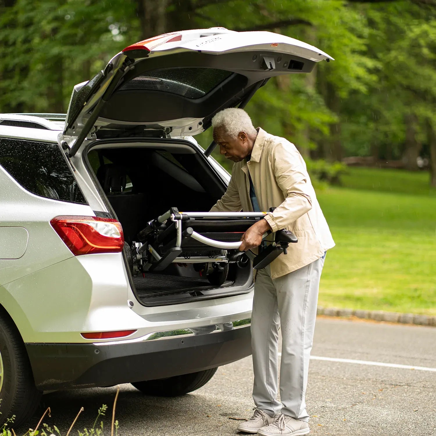 - Folds easily with a single pull release cable; once folded, it fits into the backseat or trunk of a care and can be wheeled like a piece of luggage.